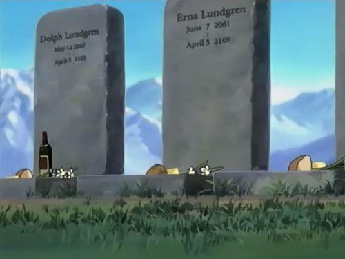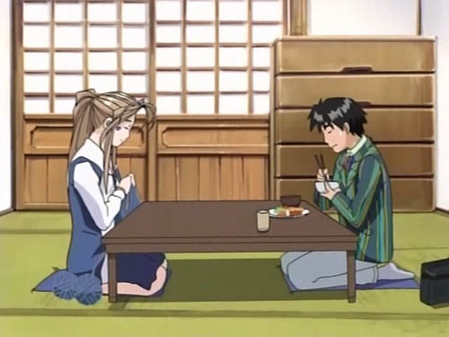 | I love how Belldandy is knitting while Keiichi is eating the dinner she cooked for him, oh those wacky Japanese. |