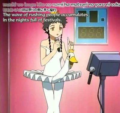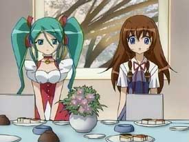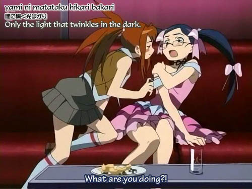 Mai-HiME's episode 16 provided a whole lot of stuff to look at. On the surface, the episode was nothing more than a filler episode with the HiMEs going to karoke and singing their hearts out. But deeper in we see a few things. First of all, ever since the first episode the long awaited lesbianism of this series finally comes out... well sort of. Some of the girls were drunk and started coming onto the other ones, but hey it's something right? Seriously though, the final story arc seems to have been laid out at the very end of the episode. The last story arc ended rather suddenly, and really they never explained how Mai suddenly returned so quickly and why she was late for class the following day. Everyone just accepts it. I was almost thinking that perhaps Mai was replaced by an evil clone, but from the rest of the episode it doesn't seem like it. The rest of this series seems to be turning into a large tournament battle. I hope it turns out a bit better than Flame of Recca.
